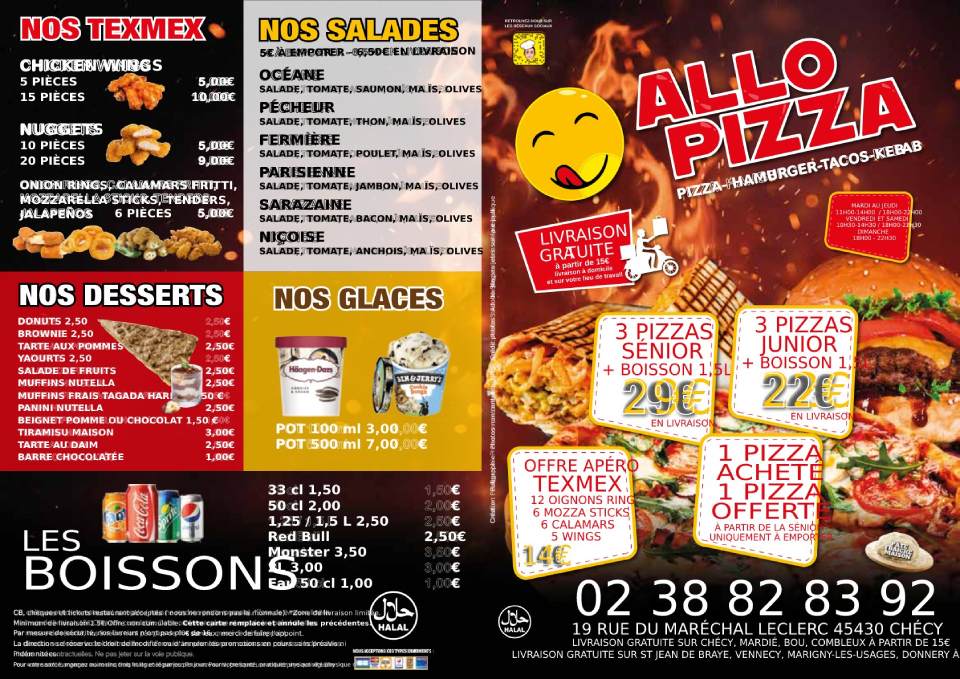 Allô Pizza Checy vous propose une carte variée contenant des pizzas, mais aussi des burgers, des tacos, des kebab ou encore des produits Tex Mex. Sur place ou à emporter (nous livrons dans les communes suivantes : Mardié, Bou, Combleux, Saint-Jean-de-Braye, Vennecy, Donnery et Marigny-les-Usages). Régalez-vous grâce à nos plats généreux et gourmands.